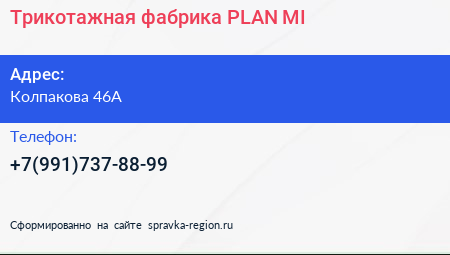 Трикотажная фабрика PLAN MI по адресу Колпакова 46А в дальнейшем Организация, размещена в следующих категориях: