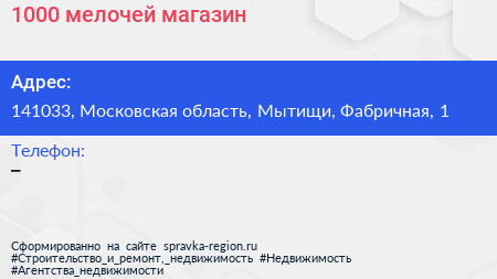 1000 мелочей, магазин по адресу 141033, Московская область, Мытищи, Фабричная, 1 в дальнейшем Организация, размещена в следующих категориях: