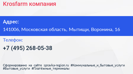 Krosfarm, компания по адресу 141006, Московская область, Мытищи, Воронина, 16 в дальнейшем Организация, размещена в следующих категориях: