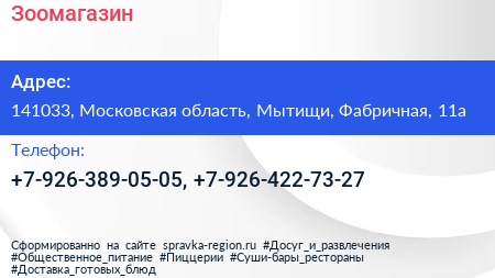 Зоомагазин по адресу 141033, Московская область, Мытищи, Фабричная, 11а в дальнейшем Организация, размещена в следующих категориях: