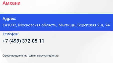 Амхани по адресу 141032, Московская область, Мытищи, Береговая 2-я, 24 в дальнейшем Организация, размещена в следующих категориях: