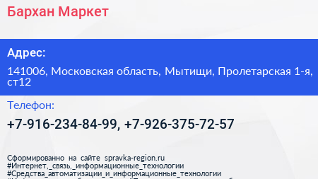 Бархан Маркет по адресу 141006, Московская область, Мытищи, Пролетарская 1-я, ст12 в дальнейшем Организация, размещена в следующих категориях: