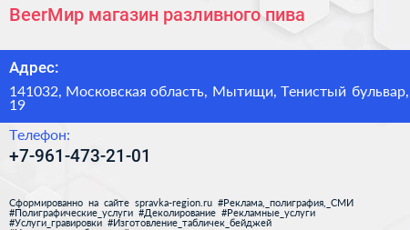 BeerМир, магазин разливного пива по адресу 141032, Московская область, Мытищи, Тенистый бульвар, 19 в дальнейшем Организация, размещена в следующих категориях: