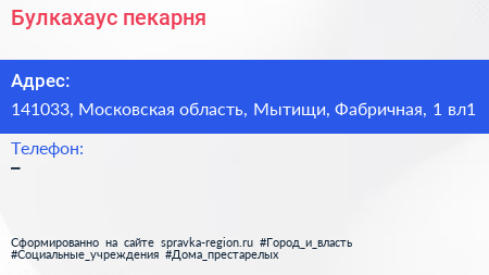 Булкахаус, пекарня по адресу 141033, Московская область, Мытищи, Фабричная, 1 вл1 в дальнейшем Организация, размещена в следующих категориях: