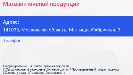 Магазин мясной продукции по адресу 141033, Московская область, Мытищи, Фабричная, 3 в дальнейшем Организация, размещена в следующих категориях: