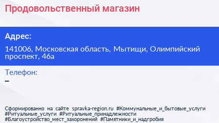 Продовольственный магазин по адресу 141006, Московская область, Мытищи, Олимпийский проспект, 46а в дальнейшем Организация, размещена в следующих категориях: