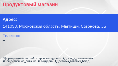 Продуктовый магазин по адресу 141033, Московская область, Мытищи, Сазонова, 5Б в дальнейшем Организация, размещена в следующих категориях: