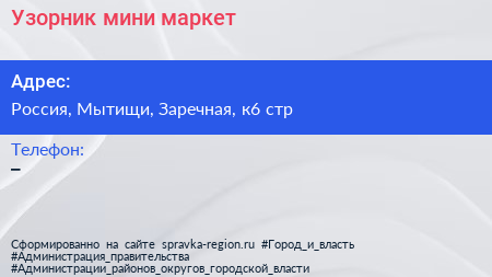 Узорник, мини-маркет по адресу 7А, Заречная улица, Жилой комплекс «Афродита», посёлок Мебельной Фабрики, Пирогово, городской округ Мытищи, Московская область, Центральный федеральный округ, 141033, Россия в дальнейшем Организация, размещена в следующих категориях: