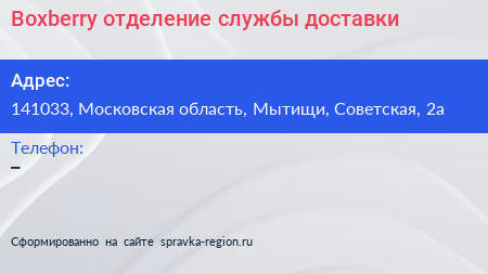 Boxberry, отделение службы доставки по адресу 141033, Московская область, Мытищи, Советская, 2а в дальнейшем Организация, размещена в следующих категориях: