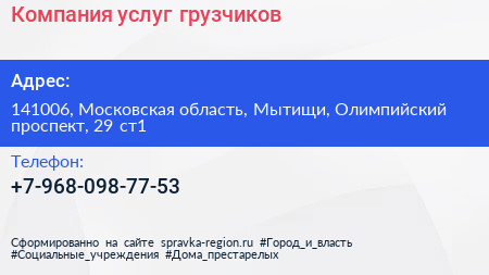 Компания услуг грузчиков по адресу 141006, Московская область, Мытищи, Олимпийский проспект, 29 ст1 в дальнейшем Организация, размещена в следующих категориях: