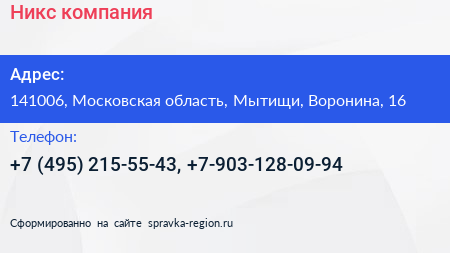 Никс, компания по адресу 141006, Московская область, Мытищи, Воронина, 16 в дальнейшем Организация, размещена в следующих категориях: