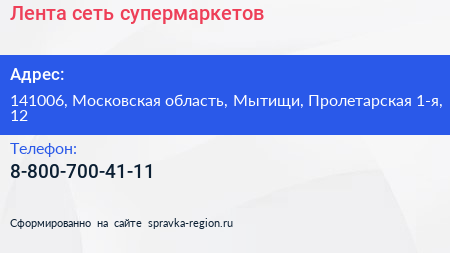 Лента, сеть супермаркетов по адресу 141006, Московская область, Мытищи, Пролетарская 1-я, 12 в дальнейшем Организация, размещена в следующих категориях:
