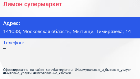 Лимон, супермаркет по адресу 141033, Московская область, Мытищи, Тимирязева, 14 в дальнейшем Организация, размещена в следующих категориях:
