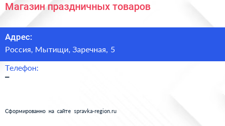 Магазин праздничных товаров по адресу 5, Заречная улица, Жилой комплекс «Афродита», посёлок Мебельной Фабрики, Пирогово, городской округ Мытищи, Московская область, Центральный федеральный округ, 141033, Россия в дальнейшем Организация, размещена в следующих категориях: