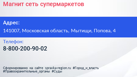 Магнит, сеть супермаркетов по адресу 141007, Московская область, Мытищи, Попова, 4 в дальнейшем Организация, размещена в следующих категориях: