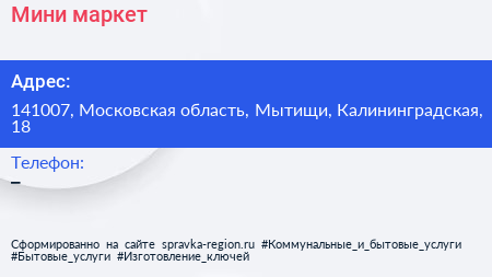 Мини-маркет по адресу 141007, Московская область, Мытищи, Калининградская, 18 в дальнейшем Организация, размещена в следующих категориях: