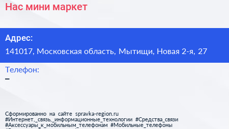 Нас, мини-маркет по адресу 141017, Московская область, Мытищи, Новая 2-я, 27 в дальнейшем Организация, размещена в следующих категориях: