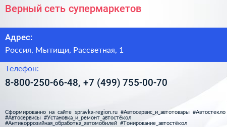 Верный, сеть супермаркетов по адресу 1, Рассветная улица, Жилой комплекс «Афродита-2», посёлок Мебельной Фабрики, городской округ Мытищи, Московская область, Центральный федеральный округ, 141033, Россия в дальнейшем Организация, размещена в следующих категориях: