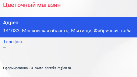 Цветочный магазин по адресу 141033, Московская область, Мытищи, Фабричная, вл6а в дальнейшем Организация, размещена в следующих категориях: