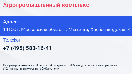 Агропромышленный комплекс по адресу 141007, Московская область, Мытищи, Хлебозаводская, 4 в дальнейшем Организация, размещена в следующих категориях:
