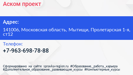Аском-проект по адресу 141006, Московская область, Мытищи, Пролетарская 1-я, ст12 в дальнейшем Организация, размещена в следующих категориях: