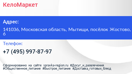 КелоМаркет по адресу 141036, Московская область, Мытищи, посёлок Жостово, 6 в дальнейшем Организация, размещена в следующих категориях:
