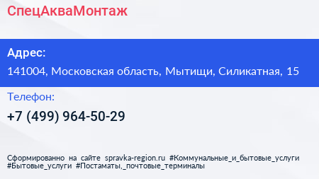СпецАкваМонтаж по адресу 141004, Московская область, Мытищи, Силикатная, 15 в дальнейшем Организация, размещена в следующих категориях: