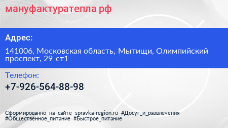 мануфактуратепла.рф по адресу 141006, Московская область, Мытищи, Олимпийский проспект, 29 ст1 в дальнейшем Организация, размещена в следующих категориях:
