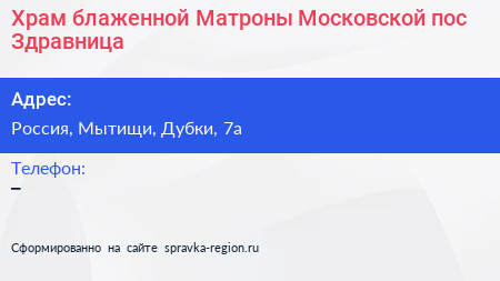 Храм блаженной Матроны Московской, поc. Здравница по адресу Московский областной клинический противотуберкулезный диспансер. Клиника № 1, Тополиная улица, Свиноедово, городской округ Мытищи, Московская область, Центральный федеральный округ, 141033, Россия в дальнейшем Организация, размещена в следующих категориях: