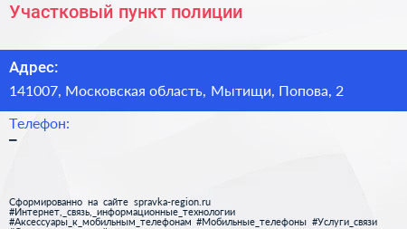 Участковый пункт полиции по адресу 141007, Московская область, Мытищи, Попова, 2 в дальнейшем Организация, размещена в следующих категориях: