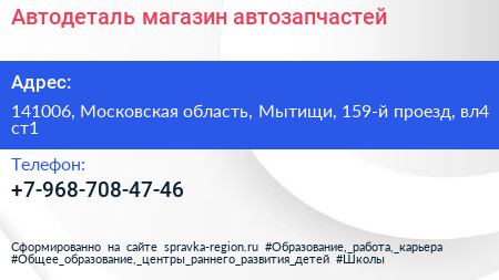 Автодеталь, магазин автозапчастей по адресу 141006, Московская область, Мытищи, 159-й проезд, вл4 ст1 в дальнейшем Организация, размещена в следующих категориях: