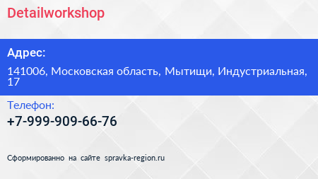 Detailworkshop по адресу 141006, Московская область, Мытищи, Индустриальная, 17 в дальнейшем Организация, размещена в следующих категориях: