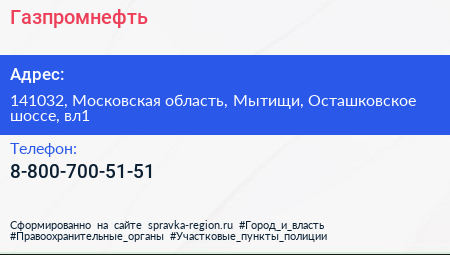 Газпромнефть по адресу 141032, Московская область, Мытищи, Осташковское шоссе, вл1 в дальнейшем Организация, размещена в следующих категориях: