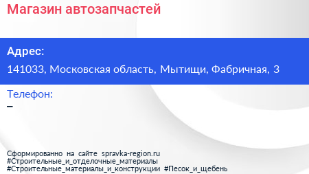 Магазин автозапчастей по адресу 141033, Московская область, Мытищи, Фабричная, 3 в дальнейшем Организация, размещена в следующих категориях: