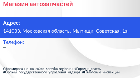 Магазин автозапчастей по адресу 141033, Московская область, Мытищи, Советская, 1а в дальнейшем Организация, размещена в следующих категориях: