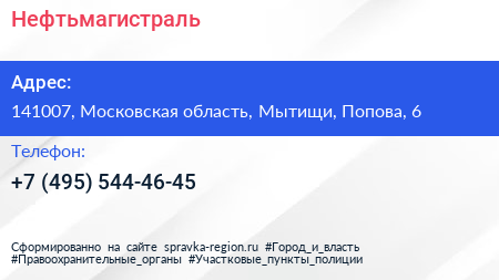 Нефтьмагистраль по адресу 141007, Московская область, Мытищи, Попова, 6 в дальнейшем Организация, размещена в следующих категориях: