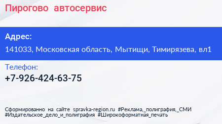 Пирогово+, автосервис по адресу 141033, Московская область, Мытищи, Тимирязева, вл1 в дальнейшем Организация, размещена в следующих категориях: