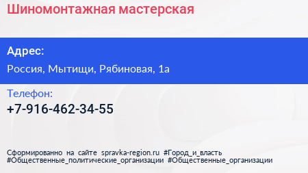Шиномонтажная мастерская по адресу Лесовичок, 7А, Осташковское шоссе, Новая Деревня, Туристический Пансионат "Клязьминское водохранилище", городской округ Мытищи, Московская область, Центральный федеральный округ, 141036, Россия в дальнейшем Организация, размещена в следующих категориях: