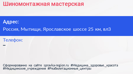 Шиномонтажная мастерская по адресу Кардиологический санаторий "Подлипки", Северная улица, 43 квартал, Комитетский Лес, Королёв, городской округ Королёв, Московская область, Центральный федеральный округ, 141005, Россия в дальнейшем Организация, размещена в следующих категориях:
