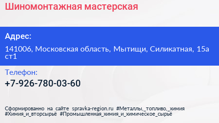 Шиномонтажная мастерская по адресу 141006, Московская область, Мытищи, Силикатная, 15а ст1 в дальнейшем Организация, размещена в следующих категориях: