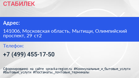 СТАБИЛЕК по адресу 141006, Московская область, Мытищи, Олимпийский проспект, 29 ст2 в дальнейшем Организация, размещена в следующих категориях: