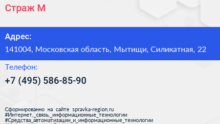 Страж-М по адресу 141004, Московская область, Мытищи, Силикатная, 22 в дальнейшем Организация, размещена в следующих категориях: