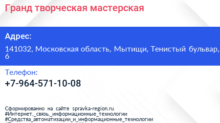 Гранд, творческая мастерская по адресу 141032, Московская область, Мытищи, Тенистый бульвар, 6 в дальнейшем Организация, размещена в следующих категориях: