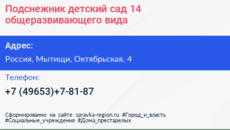 Подснежник, детский сад №14 общеразвивающего вида по адресу Детский сад №4 "Светлячок", Октябрьская улица, ДНТ «имени Менжинского», Челюскинский, Пушкинский городской округ, Московская область, Центральный федеральный округ, 141221, Россия в дальнейшем Организация, размещена в следующих категориях: