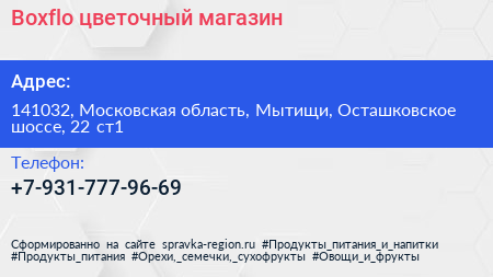 Boxflo, цветочный магазин по адресу 141032, Московская область, Мытищи, Осташковское шоссе, 22 ст1 в дальнейшем Организация, размещена в следующих категориях: