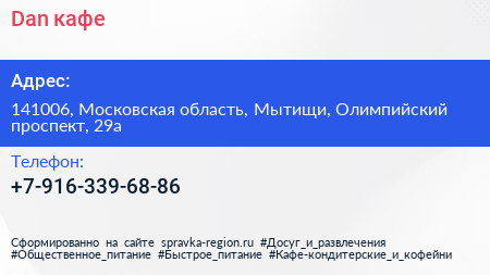 Dan, кафе по адресу 141006, Московская область, Мытищи, Олимпийский проспект, 29а в дальнейшем Организация, размещена в следующих категориях: