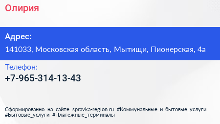 Олирия по адресу 141033, Московская область, Мытищи, Пионерская, 4а в дальнейшем Организация, размещена в следующих категориях: