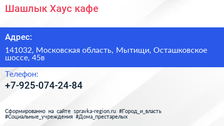 Шашлык Хаус, кафе по адресу 141032, Московская область, Мытищи, Осташковское шоссе, 45в в дальнейшем Организация, размещена в следующих категориях: