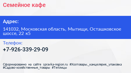 Семейное, кафе по адресу 141032, Московская область, Мытищи, Осташковское шоссе, 22 к5 в дальнейшем Организация, размещена в следующих категориях: