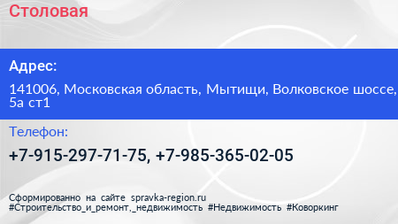 Столовая по адресу 141006, Московская область, Мытищи, Волковское шоссе, 5а ст1 в дальнейшем Организация, размещена в следующих категориях: